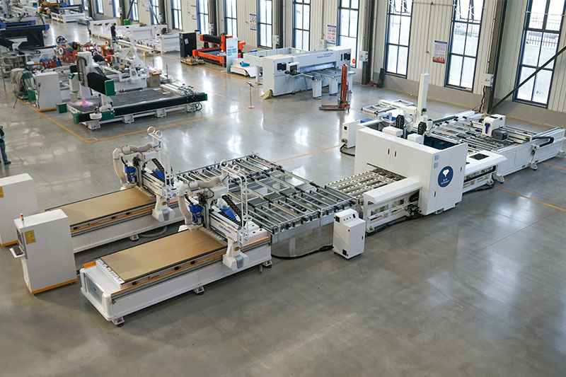 一拖二贴标钻切单元是一套自动化程度比较高的数控开料解决方案。由三工位龙门上料、自动贴标机、双钻包六面钻、两台全自动数控开料机以及动力滚筒线、中控系统组成。可实现自动上料、自动贴标、上下孔槽及切割加工。是一种自动化程度高,效率高、性价比高的板式家具自动化生产方案。